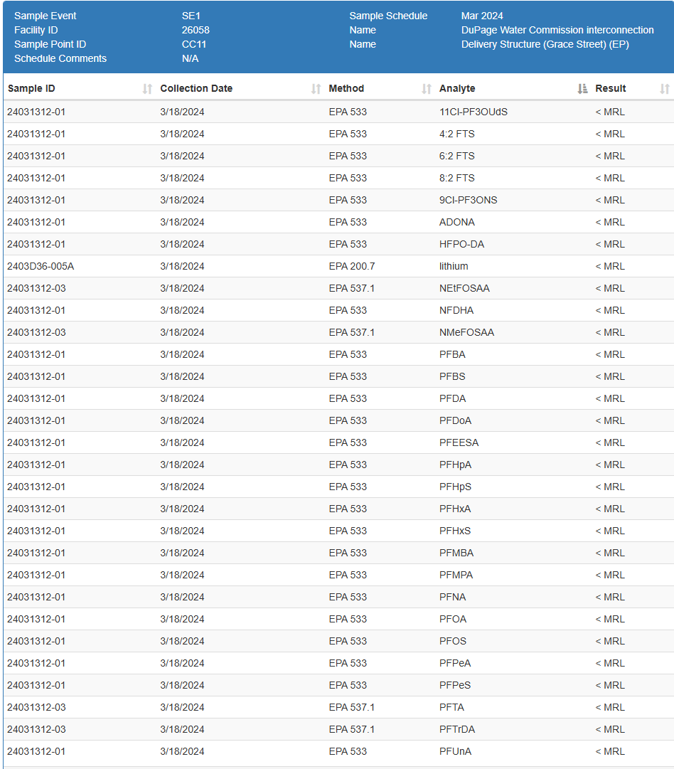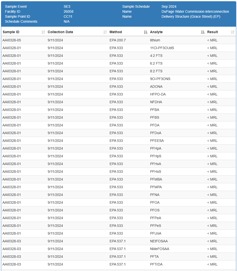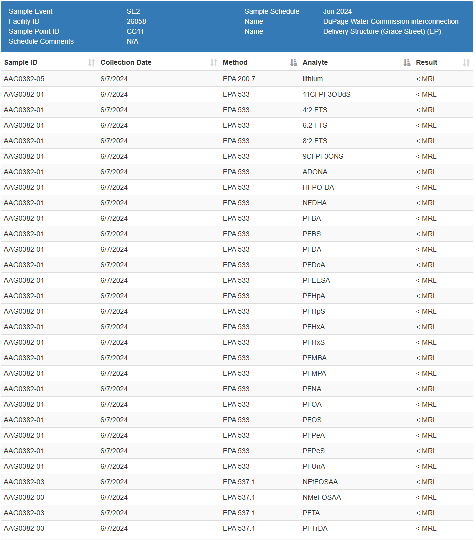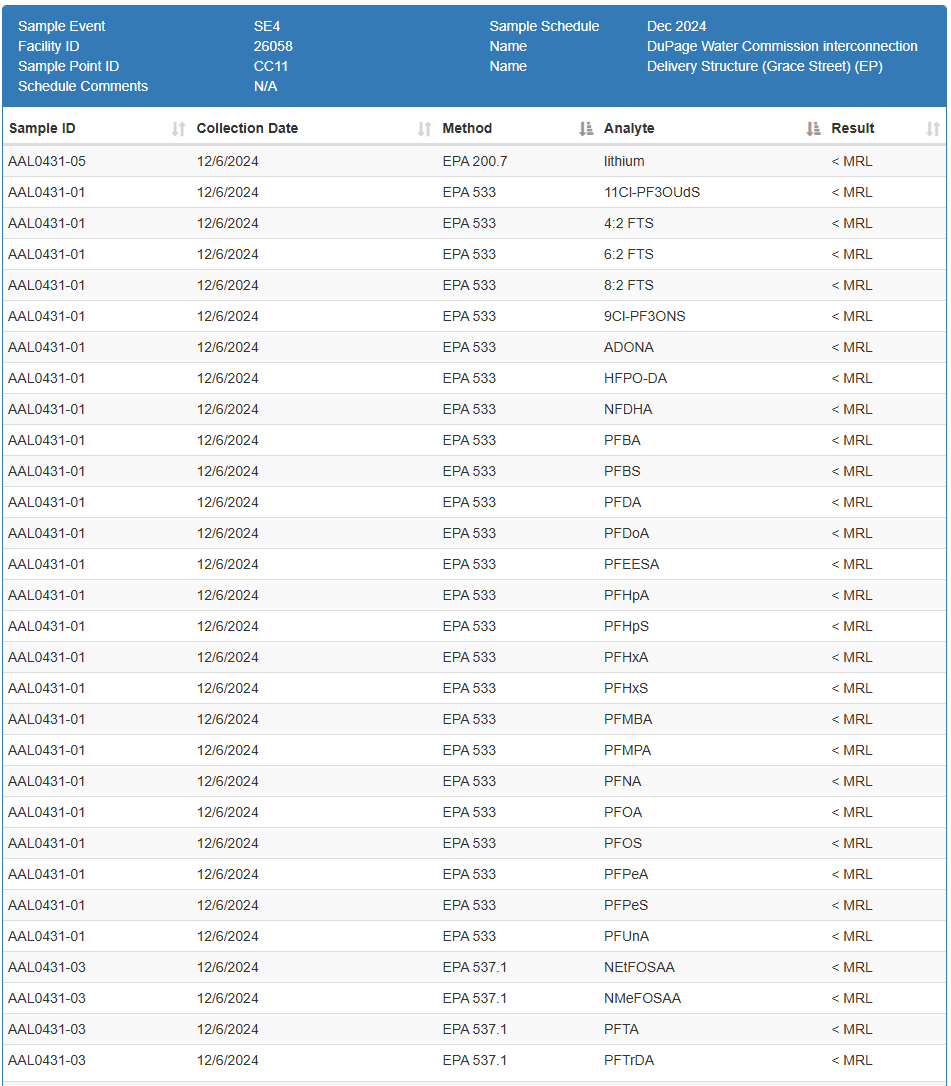 As the Village of Lombard receives finished water from Lake Michigan treated at the Jardine Water Purification Plant in Chicago via the DuPage Water Commission, UCMR 5 water sampling was completed and no detectable unregulated contaminants were found in the water supplied and tested to the Village of Lombard residents.
